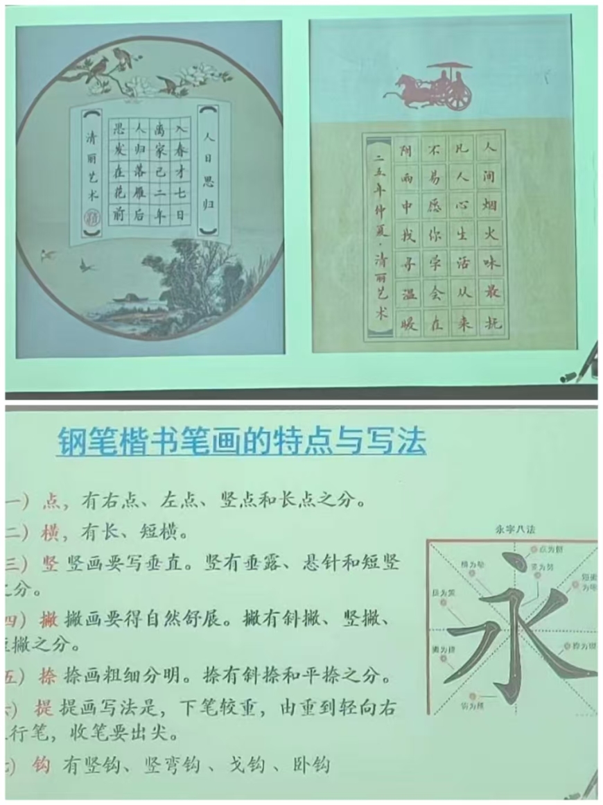 结合多年书法教学经验,刘老师通过现场书写示范、教学视频展播、优秀作品赏析等多样化形式,指导学生规范握笔与坐姿,纠正不良书写习惯,并详细拆解“永”字八法的起笔、行笔、收笔技巧。让学生直观体悟汉字书写的笔法精髓与结构美感。