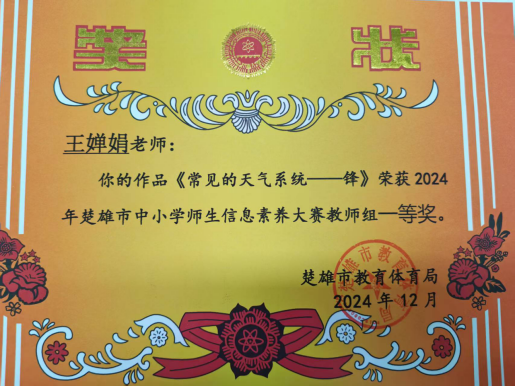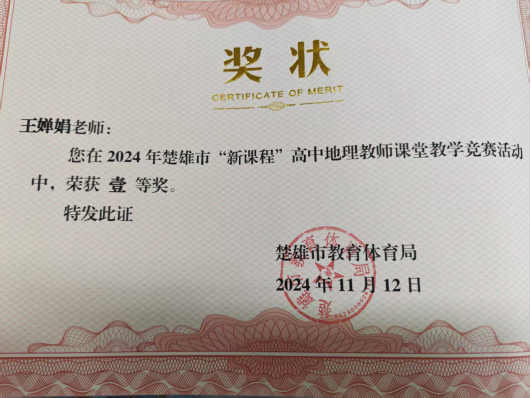 1.荣获楚雄市高中地理教师课堂竞赛活动一等奖、市中学生信息素养大赛教师组一等奖等多项教学类奖项;