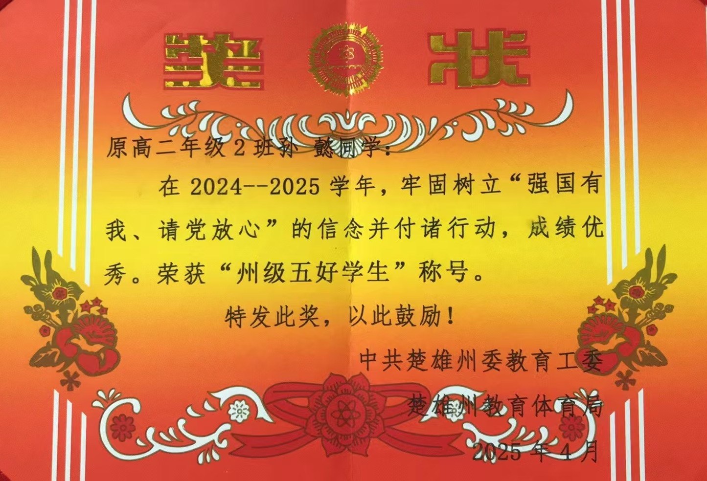 孙懿学习态度端正,目标明确,成绩稳居年级前列。曾荣获“2024年楚雄州州级五好学生”、“2025年化学奥林匹克竞赛初赛云南赛区国家级二等奖”等荣誉。他始终以高标准要求自己,注重个人修养与社会责任感。立志考入顶尖高校,未来致力于人工智能领域研究,为科技强国贡献力量。