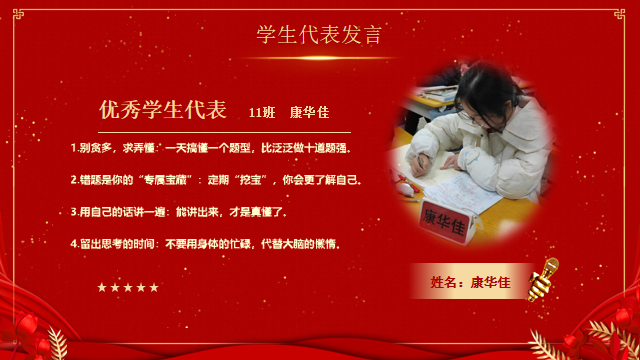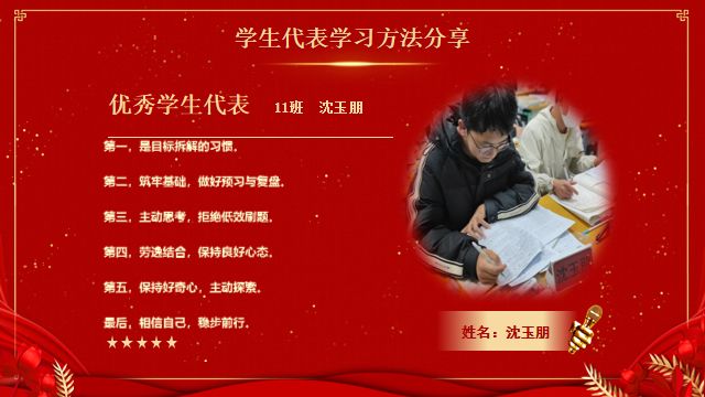 成绩优秀学生代表作学习方法分享交流。11班康华佳、沈玉朋两位同学以“今天的荣耀是明天的阶梯”共勉,呼吁同学们脚踏实地、持续奋进。