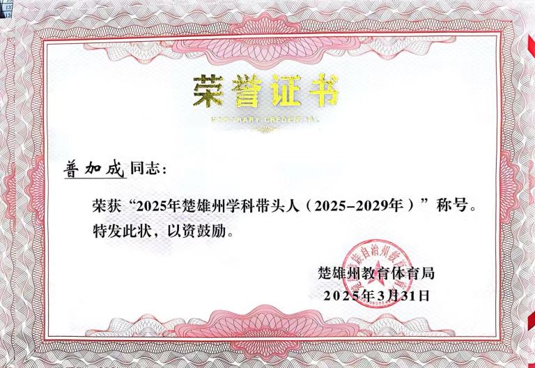 普加成,硕士研究生,高中语文一级教师,从教16载,9年班主任工作经验,8届高三毕业班工作经历。云南省骨干教师、楚雄州州级学科带头人、楚雄州第二届名班主任、楚雄市“百名教育教学能手”、楚雄市骨干教师,历任备课组长、党工组长、党政办副主任、党政办主任。2024年8月至11月赴上海参加“楚雄市中小学(幼儿园)管理干部赴上海跟岗研训”,在上海嘉定一中跟岗学习。自投身教育事业以来,始终恪守教育初心,深耕教学一线,践行着“立德树人”的根本任务,以严谨务实的治学态度、潜心育人的敬业精神,扎实的专业功底与丰富的教学经验,赢得学生爱戴、家长认可与同行赞誉。