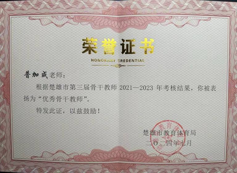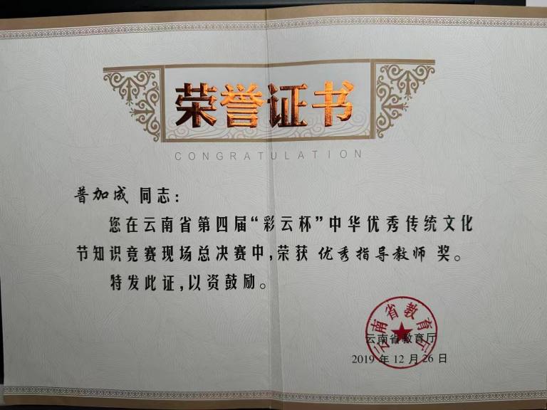 4.楚雄市第三届骨干教师考评为“优秀”,楚雄州第三届高中语文名师工作室“优秀成员”;