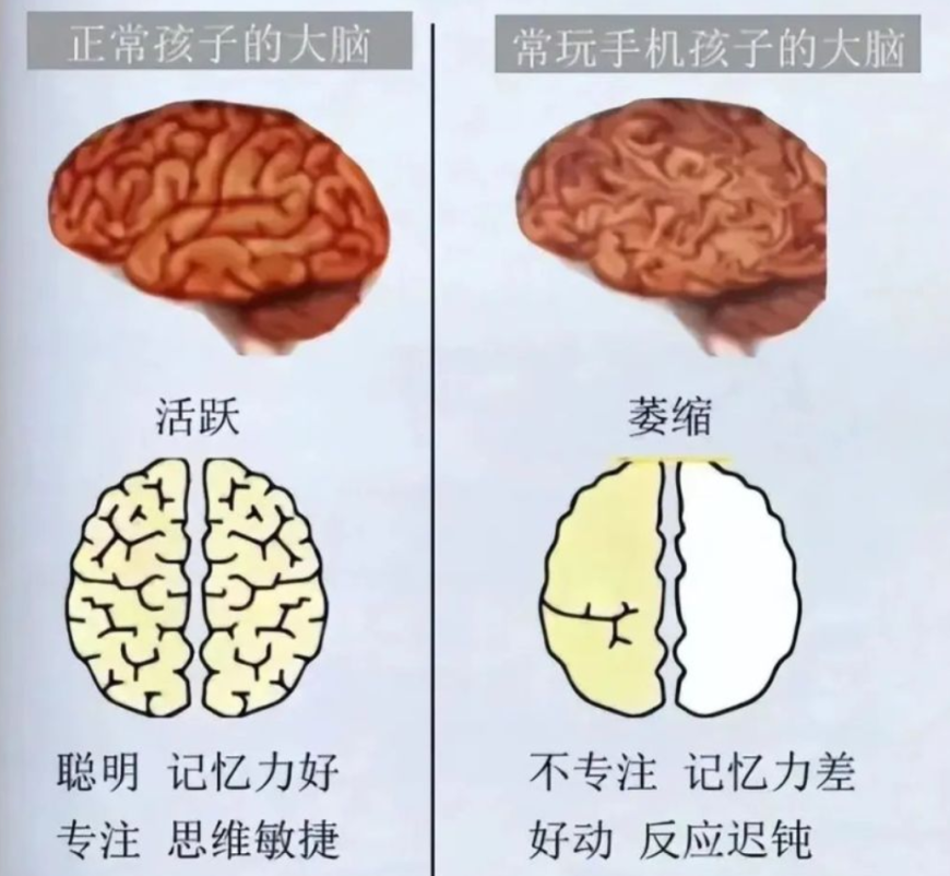 过度使用手机会使得大脑灰质减少,情绪暴躁;大脑白质受损,脑子变笨;影响大脑的奖赏系统;削弱大脑的记忆功能。所以同学们应根据自身需求设定合理的上网时间,避免过度沉迷。多参与社交活动,培养兴趣爱好,尝试学习新的技能,让生活充实而有趣,减少对网络的依赖。