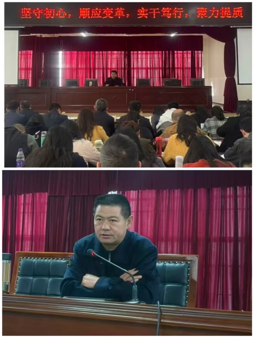 洪云校长以“坚守初心,顺应变革,实干笃行,聚力提质”为主题,结合学校发展规划,全面总结上学期学校工作成效与存在不足。他强调,要抓实教育教学管理,深入推进全员导师制、不断完善校本教研、精心组织教师课堂教学竞赛,抓实青年教师培养工作;要强化一种意志,践行两项行动,正视自身差距,牢固树立“常规 + 细节 + 过程 = 有效管理”的理念,建立健全师德师风建设长效机制,夯实教师的思想根基。同时激励全体教师强化责任担当、严守工作规范、筑牢安全防线、提升执行力能力,以实干担当推动学校教育教学高质量发展。